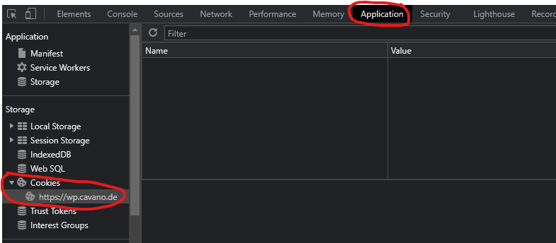 In der Entwicklerkonsole unter „Application“ findet man die Cookies. Bei zusätzlichen externen Inhalten auf der Website werden darunter weitere Domains aufgeführt. Es sollte daher lediglich die eigene (Sub)Domain aufgeführt werden, die entsprechend anzuklicken ist.