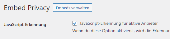 Wenn ein Cache-Plugin (z. B. Autoptimize) zur Optimierung der Website genutzt wird, sollte die JavaScript-Erkennung (Unter „Einstellungen -> Embed Privacy“) aktiviert werden.