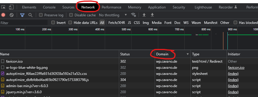 Dies lässt sich im Tab „Network“ (Netzwerk) anzeigen. Standardmäßig wird dort die Spalte „Domain“ jedoch nicht angezeigt, welche mit einem Rechtsklick auf eine anderen Spaltentitel (wie z. B. „Status“) aktiviert werden kann.